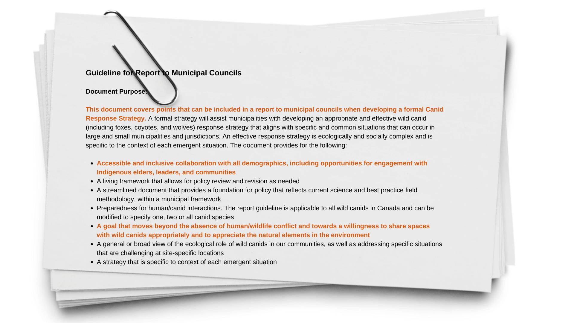 Document Purpose: This document is intended to provide information that can be used when building a Municipal Canid Response Strategy (MCRS), guidelines for reports to Council, and accompanying organizational Standard Operational Procedure (SOP). Resources such as our science-enriched infographics are included as well.
